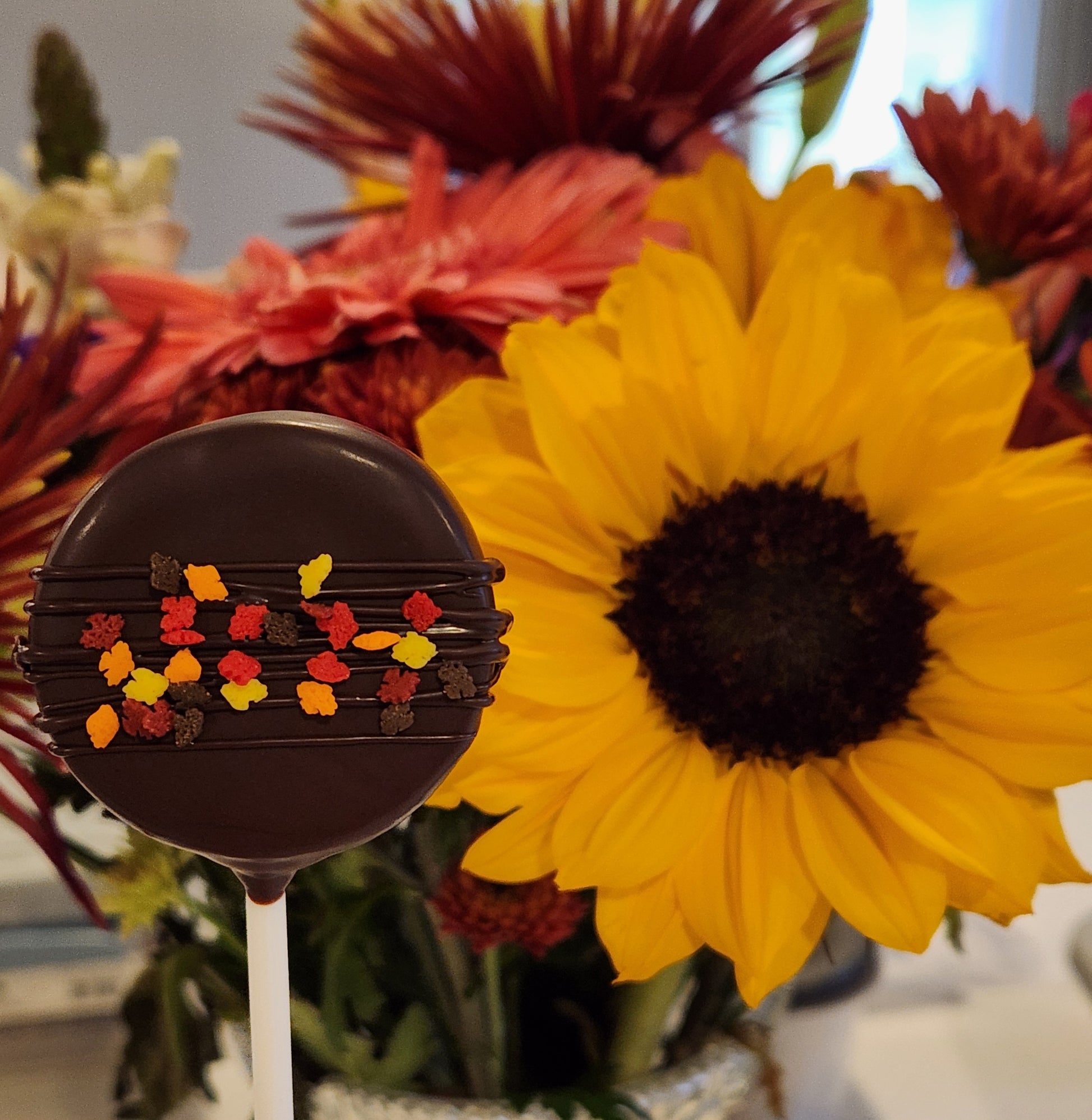 Cake pops in your choice of cake flavor & coating topped with a festive fall drizzle & sprinkles.